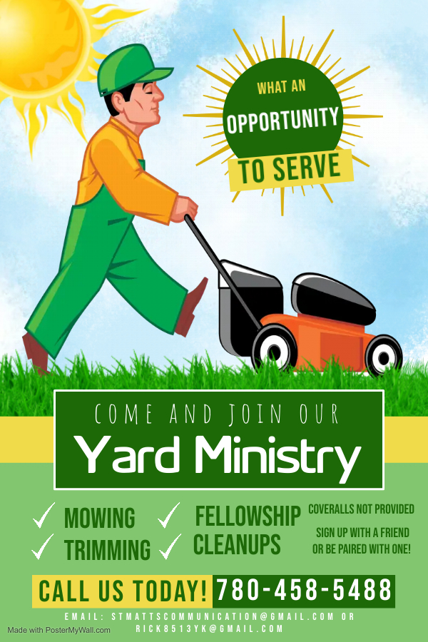 The grounds of St. Matthews are maintained on a volunteer basis by a wonderful group of volunteers; some people offer to look after more winter-based maintenance while others are more drawn to the spring/summer work. You are welcome to be a part of a small piece of the ministry or as much as you wish. Typically volunteers will sign up with a friend to split the work with or can be paired with another individual and then, as with any work, the tasks are divided by roster. I.e., you might only have to cut the grass twice a summer based on the rate of growth and number of volunteers willing to help. All the equipment required for the job is maintained and provided (lawnmowers, trimmers, snow blowers, shovels, etc.). You can email for more information or see the poster below!